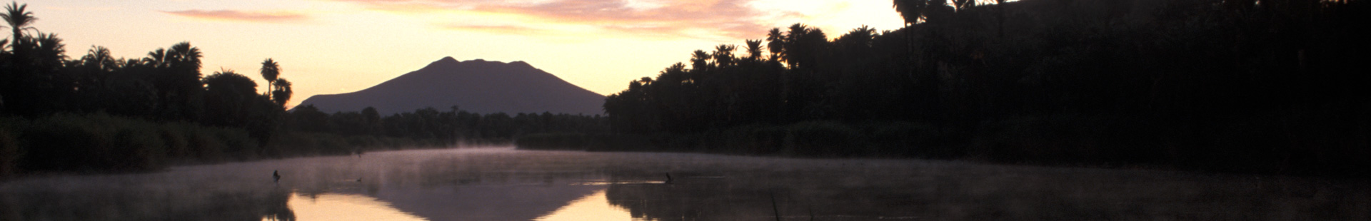Suddenly, 90 miles (145 km) south of Guerrero Negro, a green spot amidst the usual brown hues of the scorched landscape of Baja California: the oasis of San Ignacio. From an underground water reservoir, the precious liquid emerges, is dammed up and used for the irrigation of some 100,000 date palms, citrus trees, figs and other produce. The trees shade San Ignacio, a small village with old colonial buildings, where haste and rush are unknown. The 4,000 inhabitants do their routine work, as they have always done, and, in recent days, have begun to devote themselves to the care of the few tourists who have discovered the charm of this place.